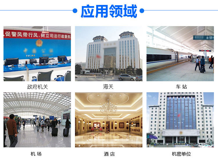 適用于酒店、網(wǎng)吧、賓館、機(jī)場(chǎng)、考場(chǎng)入口;公安、邊防、展館、公證處、銀行、證券;監(jiān)獄管理等場(chǎng)所。