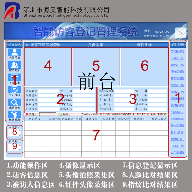 1.功能操作區(qū) 2.訪(fǎng)客信息區(qū) 3.被訪(fǎng)人信息區(qū) 4.攝像顯示區(qū) 5.頭像拍照采集區(qū) 6.證件頭像采集區(qū) 7.信息登記顯示區(qū) 8.人臉比對(duì)結(jié)果區(qū) 9.指紋比對(duì)結(jié)果區(qū)