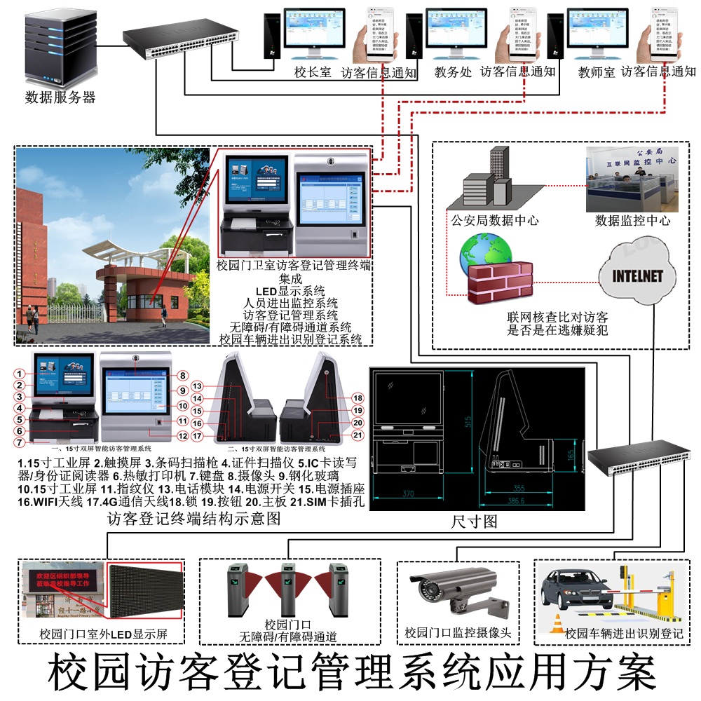 校門口LED顯示系統(tǒng):LED屏直接經(jīng)過交換機(jī)與訪客機(jī)終端相連,由訪客登記管理系控制用來發(fā)布學(xué)校信息通知,顯示人員進(jìn)出信息和快遞包裹信件信息,LED的尺寸及顯示模式參數(shù)由客戶選定。