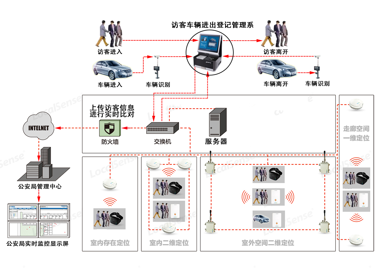 實時定位來訪人員和來訪車輛位置,運動車輛、人員的位置可以以軌跡形式顯示展示行進軌跡;定位精度 10厘米,一般遮擋30厘米,特種應(yīng)用5厘米。