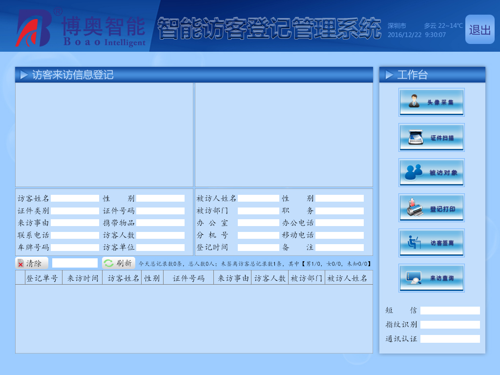 ? ? ??為了進一步加強居住、辦公,學校等場合的安全化管理,同時適應(yīng)信息化條件下的無紙化辦公、自動化辦公以及訪客信息的長期有效保存、即時查詢等,因此智能訪客管理系統(tǒng)就成為了各企業(yè)事業(yè)單位迫切需要的自動化和智能化訪客管理的必需設(shè)備; 在此實際應(yīng)用需求的基礎(chǔ)上,博奧智能公司自主研發(fā)一套更加科學,先進、完善、高效、智能信息化的訪客登記定位管理系統(tǒng)來保障居住、辦公,學校等場合的安全,嚴格控制和管理人員出入及進入場所范圍定位和行動軌跡;智能訪客定位管理系統(tǒng)通過對來訪人員的各種證件進行掃描識別采集上傳,指紋采集比對,并和公安局所提供接口進行對接,自動進行實時比對,判斷是否在逃嫌疑人員;利用攝像機對來訪人員拍照,打印進門憑條,發(fā)放臨時進門卡等方式,對來訪人員進入場所進行定位和實時軌跡跟蹤。