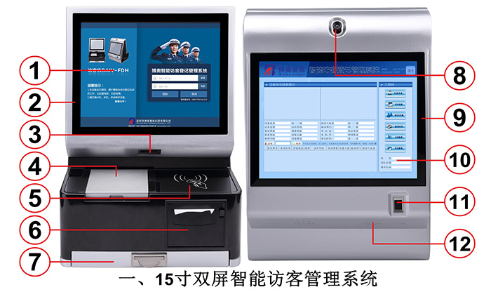 15寸雙屏智能訪客登記管理一體機(jī)集成工控主板,液晶屏,電容觸摸屏,鍵盤,證件掃描采集儀,身份證閱讀器,IC卡發(fā)卡器/讀卡器,指紋儀,條碼掃描儀,熱敏打印機(jī),攝像頭,電話模塊,喇叭等,15寸雙屏智能訪客機(jī)是由博奧智能科技有限公司研發(fā)生產(chǎn)的一款高科智能訪客登記管理終端,采用15寸工業(yè)液晶屏,前后雙屏,主板自主研發(fā),X86結(jié)構(gòu),板載Intel第四代Hasswall和第五代Broadwell平臺CPU,客戶行選定,板載4G/8G內(nèi)存,客戶也可自行選定內(nèi)存大小 ,板載WIFI藍(lán)牙模塊及大功率功放模塊,固態(tài)硬盤存儲;設(shè)備外殼采用鈑金材料,表面精工打磨,烤漆清油等處理工藝,防銹、耐磨;它具有結(jié)構(gòu)合理,操作簡便,速度快,運行穩(wěn)定,性能可靠,功能強(qiáng)大,集成度高,適用領(lǐng)域廣;外觀精美、造型獨特,款式新穎,色澤光潤、質(zhì)感一流等特點。