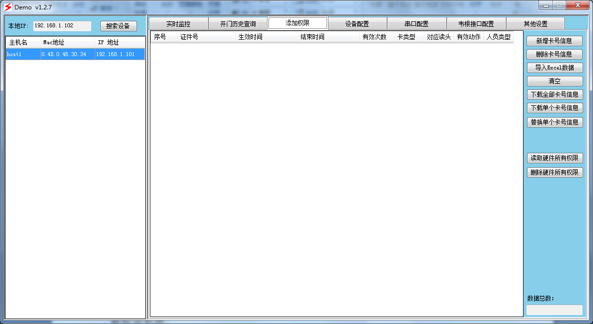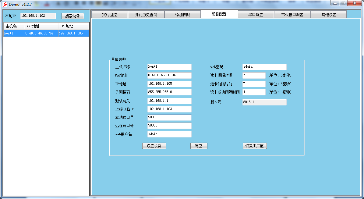 ??? ?將設(shè)備通過網(wǎng)線與電腦直接連接或者通過交換機連接,在軟件中點擊“搜索設(shè)備”按鈕,列表中將自動列出網(wǎng)絡(luò)中的門禁控制器設(shè)備。選擇記錄后可以查看并修改此設(shè)備的配置。注意必須保證計算機IP地址與設(shè)備IP地址在同一個網(wǎng)段,默認(rèn)為192.168.1.XX,否則不能成功搜索和修改。(通過網(wǎng)線直連電腦的情況,可能因為網(wǎng)卡不能自適應(yīng)導(dǎo)致搜索或者配置不成功,建議通過路由器連接)。如果計算機IP地址已經(jīng)修改為192.168.1.XX仍然不能搜索到設(shè)備,可以人工恢復(fù)默認(rèn)設(shè)置(在斷電時按住恢復(fù)按鈕加電,5秒后松開,鳴蜂器響即恢復(fù)成功)。