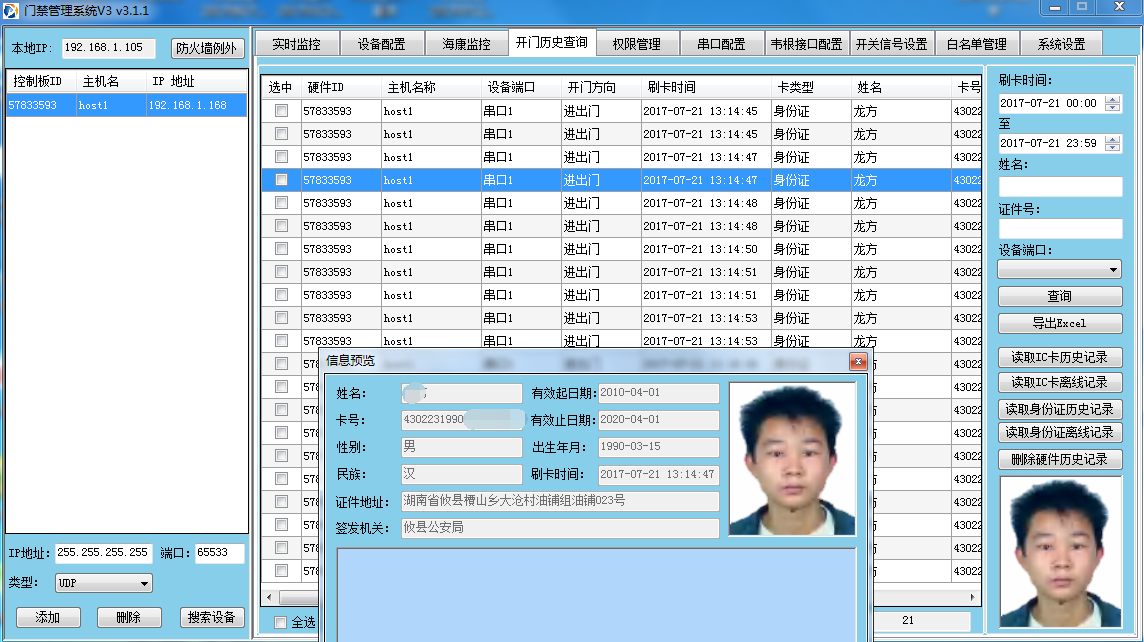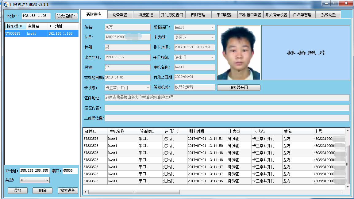 ??? 電腦白名單驗證。設(shè)備讀取到身份證信息后,發(fā)送給電腦,則電腦軟件負責(zé)檢查身份證是否有開門權(quán)限。這種方式可以通過電腦軟件實現(xiàn)大數(shù)據(jù)量的白名單驗證,以及其它時段權(quán)限控制。