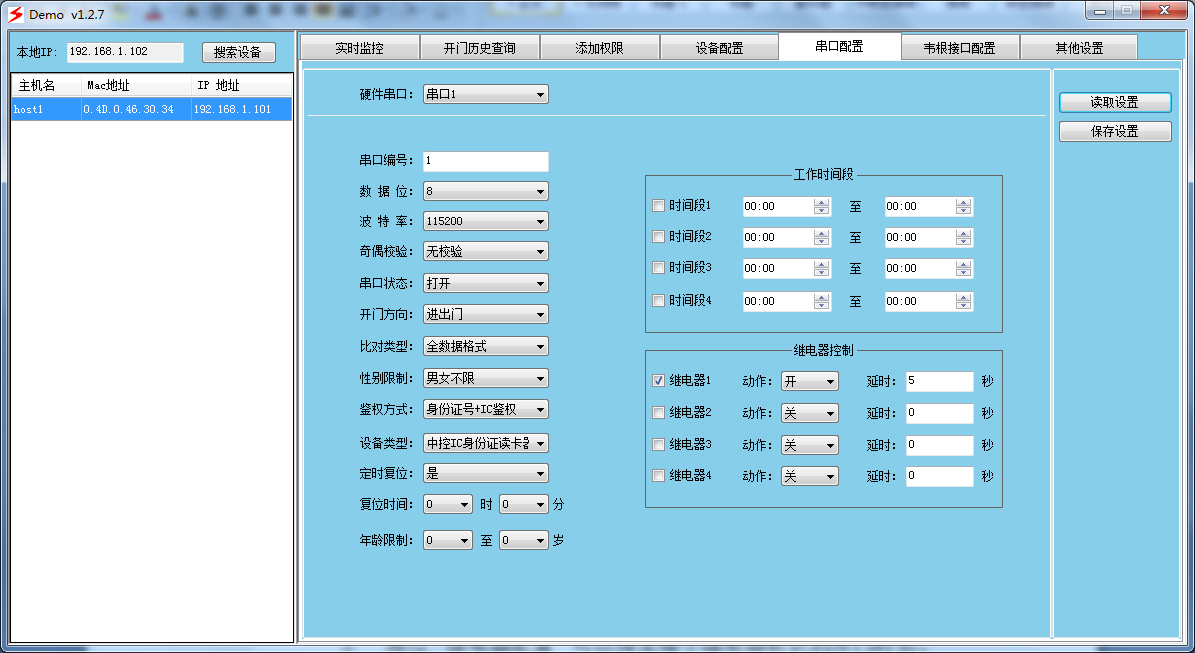 設(shè)備通過以太網(wǎng)接口與電腦連接,實現(xiàn)設(shè)備配置,權(quán)限配置,實時上報監(jiān)控,遠程開門,控制器歷史日志下載等。