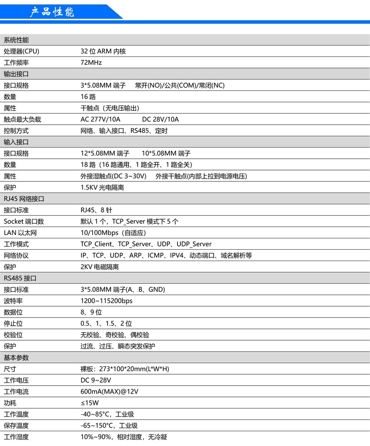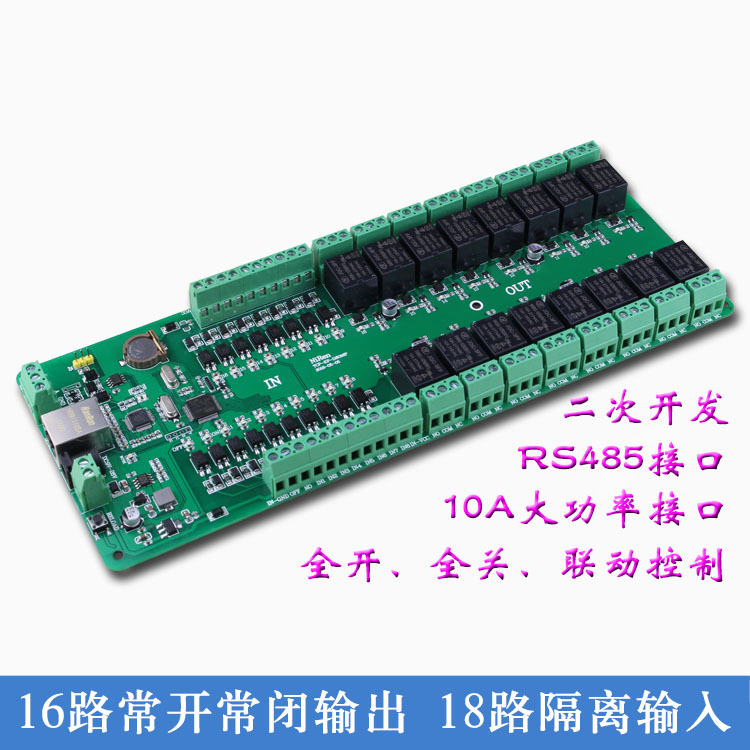 ??? 設(shè)備采用工業(yè)級設(shè)計方案,搭載32 ARM 處理器和10/100M 以太網(wǎng)網(wǎng)絡(luò)方案,具有速度快,運算能力強,穩(wěn)定性高,抗干擾能力強等特點,滿足工業(yè)環(huán)境使用要求。設(shè)備有16 路繼電器輸出、18 路開關(guān)量隔離輸入和1 RS485 接口,繼電器支持實時控制、延時控制、輸入輸出聯(lián)動控制、一鍵全開全關(guān)控制、日循環(huán)定時控制和自定義日期控制等多種控制方式,開關(guān)量輸入狀態(tài)支持被動上傳、定時上傳和觸發(fā)上傳,RS485 接口支持用于控制設(shè)備或傳輸數(shù)據(jù),以滿足更多不同的場合使用,滿足更多用戶的使用需求。