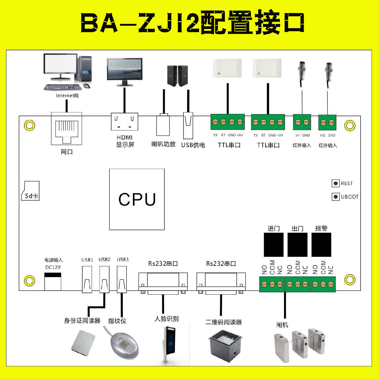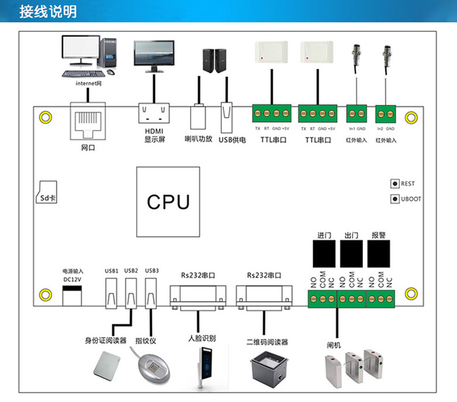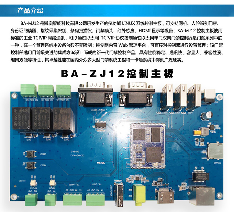 BA-MJ12是博奧智能科技有限公司研發(fā)生產(chǎn)的多功能LINUX系統(tǒng)控制主板,可支持閘機、人臉識別門禁、身份證閱讀器、指紋采集識別、條碼掃描儀、門禁讀頭、紅外感應、HDMI顯示等設(shè)備;BA-MJ12控制主板使用標準的工業(yè)TCP/IP網(wǎng)絡(luò)通訊,可以通過以太網(wǎng) TCP/IP協(xié)議控制通駐以太網(wǎng)單門雙向門禁控制器是門禁系列中的一種,在一個管理系統(tǒng)中設(shè)備臺數(shù)不受限制;控制器內(nèi)置Web管理平臺,可直接對控制器進行設(shè)置管理;該門禁控制器選用目前最先進的集成方案設(shè)計而成的新一代門禁控制產(chǎn)品。具有性能穩(wěn)定、通訊快、容量大、兼容性強、組網(wǎng)方便等特性,其卓越性能在國內(nèi)外眾多大型門禁系統(tǒng)工程和一卡通系統(tǒng)中得到廣泛證實。