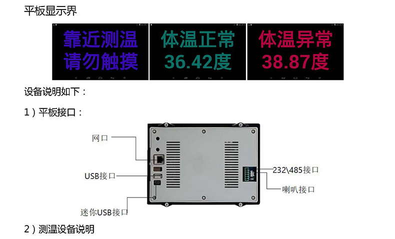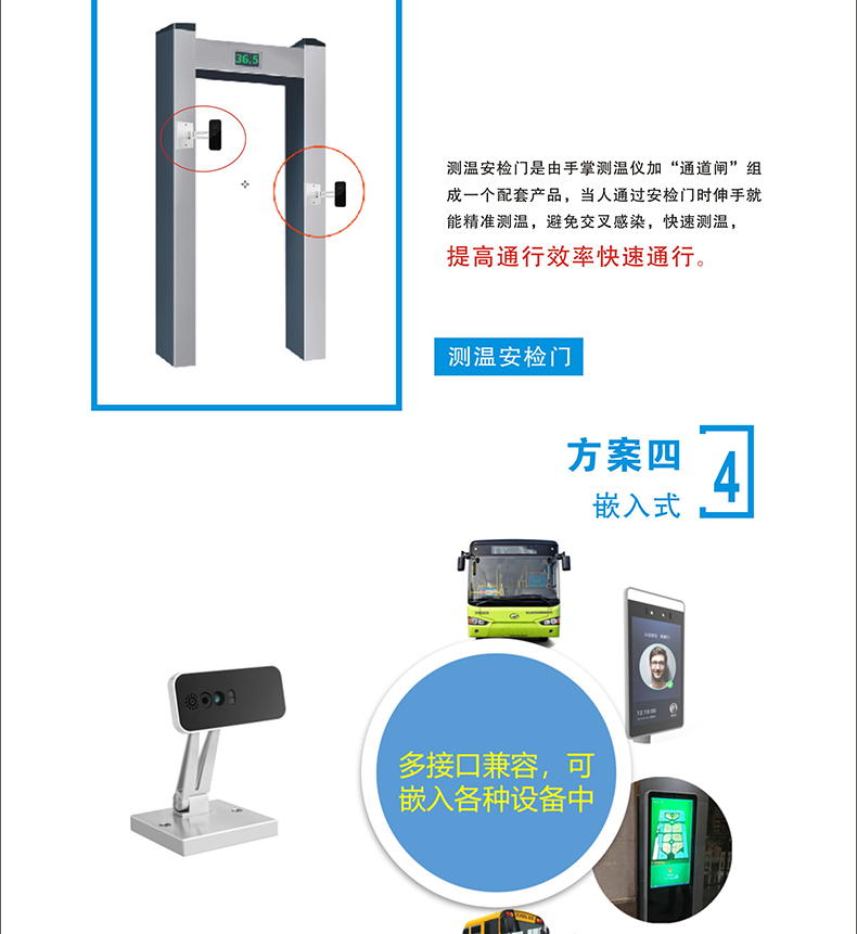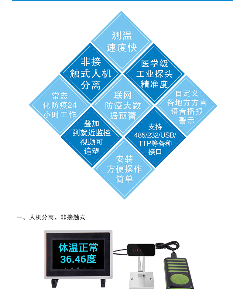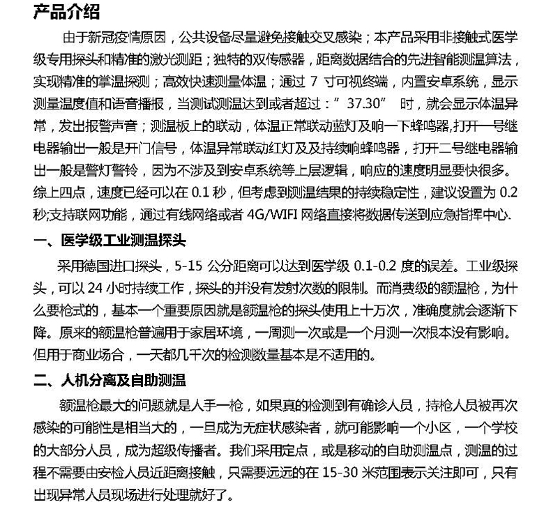 由于新冠疫情原因,公共設(shè)備盡量避免接觸交叉感染;本產(chǎn)品采用非接觸式醫(yī)學(xué)級(jí)專用探頭和精準(zhǔn)的激光測(cè)距;獨(dú)特的雙傳感器,距離數(shù)據(jù)結(jié)合的先進(jìn)智能測(cè)溫算法,實(shí)現(xiàn)精準(zhǔn)的掌溫探測(cè);高效快速測(cè)量體溫;通過(guò)7寸可視終端,內(nèi)置安卓系統(tǒng),顯示測(cè)量溫度值和語(yǔ)音播報(bào),當(dāng)測(cè)試測(cè)溫達(dá)到或者超過(guò):”37.30”