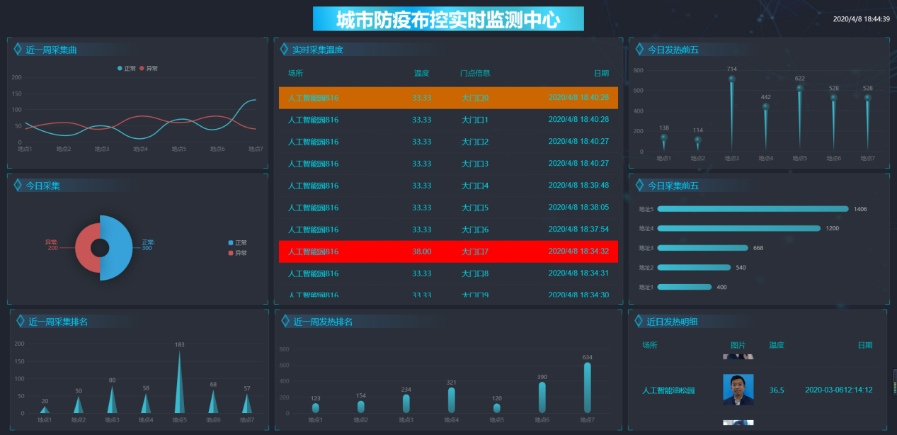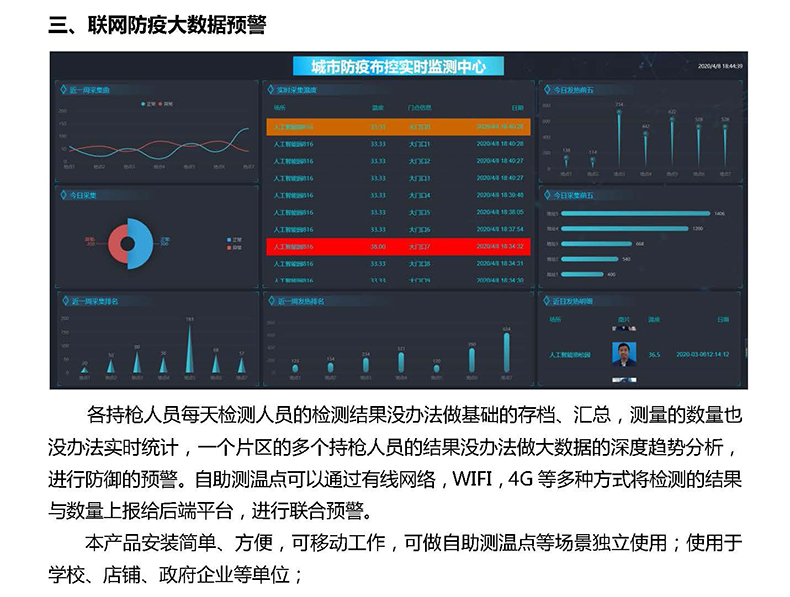 各持槍人員每天檢測(cè)人員的檢測(cè)結(jié)果沒(méi)辦法做基礎(chǔ)的存檔、匯總,測(cè)量的數(shù)量也沒(méi)辦法實(shí)時(shí)統(tǒng)計(jì),一個(gè)片區(qū)的多個(gè)持槍人員的結(jié)果沒(méi)辦法做大數(shù)據(jù)的深度趨勢(shì)分析,進(jìn)行防御的預(yù)警。自助測(cè)溫點(diǎn)可以通過(guò)有線網(wǎng)絡(luò),WIFI,4G等多種方式將檢測(cè)的結(jié)果與數(shù)量上報(bào)給后端平臺(tái),進(jìn)行聯(lián)合預(yù)警。