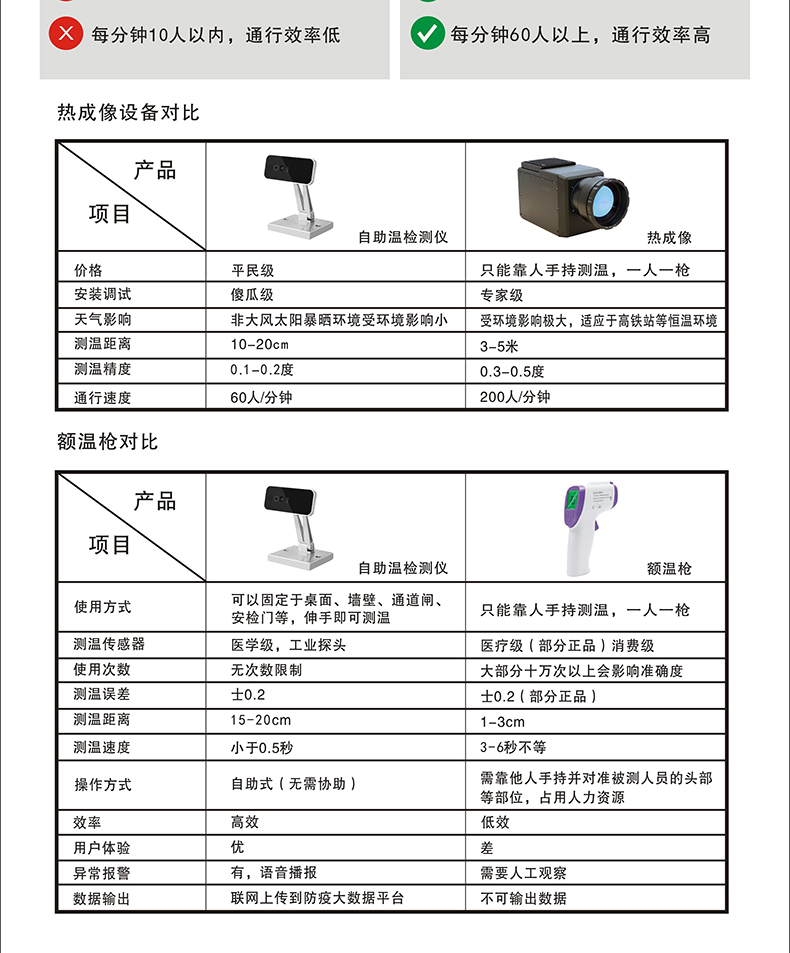 額溫槍最大的問(wèn)題就是人手一槍,如果真的檢測(cè)到有確診人員,持槍人員被再次感染的可能性是相當(dāng)大的,一旦成為無(wú)癥狀感染者,就可能影響一個(gè)小區(qū),一個(gè)學(xué)校的大部分人員,成為超級(jí)傳播者。我們采用定點(diǎn),或是移動(dòng)的自助測(cè)溫點(diǎn),測(cè)溫的過(guò)程不需要由安檢人員近距離接觸,只需要遠(yuǎn)遠(yuǎn)的在15-30米范圍表示關(guān)注即可,只有出現(xiàn)異常人員現(xiàn)場(chǎng)進(jìn)行處理就好了。