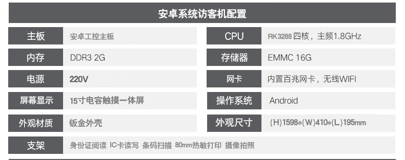 ?? ? ?15寸立式訪客機(jī)整機(jī)采用流線性設(shè)計(jì),符合人體工程原理,結(jié)構(gòu)合理,外形美觀大方,操作簡(jiǎn)單,維護(hù)方便;集成身份證閱讀 、IC卡讀寫(xiě)、 條碼掃描、 80mm熱敏打印、 攝像拍照、 多種證件OCR識(shí)別掃描(選配)功能,支持安卓和Windows系統(tǒng) ;產(chǎn)品主要用于政府機(jī)關(guān)、軍隊(duì)、公安、法院、學(xué)校、事業(yè)單位、花園小區(qū)、高檔寫(xiě)字樓、工廠等場(chǎng)所的門(mén)衛(wèi)傳達(dá)室對(duì)進(jìn)出人員信息化登記人證核驗(yàn),從而代替了傳統(tǒng)的手工登記,有效的提高了門(mén)衛(wèi)管理工作效率及證件信息登記準(zhǔn)確性,給日后的信息查詢工作更方便量更快捷。