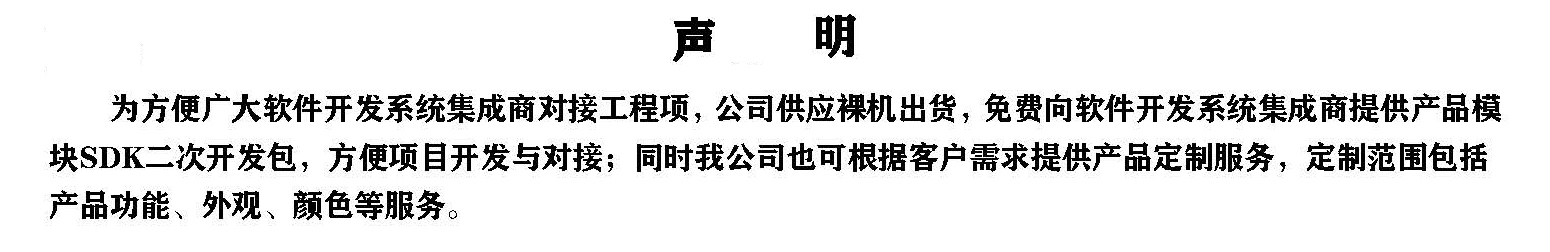 ? ? ? ? ??為方便廣大軟件開(kāi)發(fā)系統(tǒng)集成商對(duì)接工程項(xiàng),公司供應(yīng)裸機(jī)出貨,免費(fèi)向軟件開(kāi)發(fā)系統(tǒng)集成商提供產(chǎn)品模塊SDK二次開(kāi)發(fā)包,方便項(xiàng)目開(kāi)發(fā)與對(duì)接;同時(shí)我公司也可根據(jù)客戶需求提供產(chǎn)品定制服務(wù),定制范圍包括產(chǎn)品功能、外觀、顏色等服務(wù)。