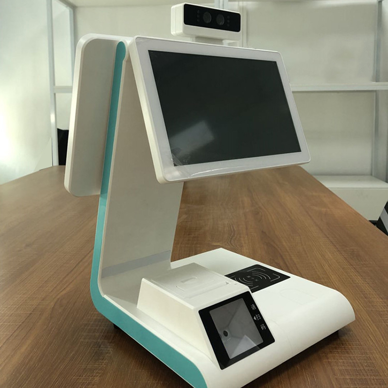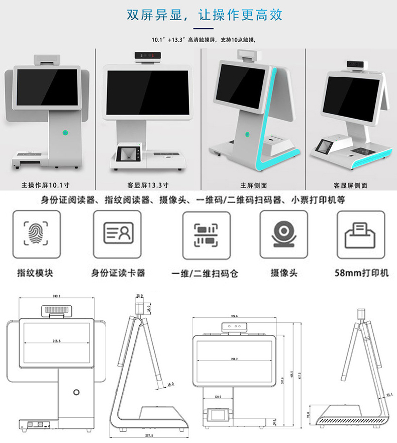 功能配置:主屏10.1寸 副屏13.3寸 身份證閱讀器 IC卡讀寫(xiě)器 58mm熱敏打印機(jī) 條碼掃描儀 指紋(選配)