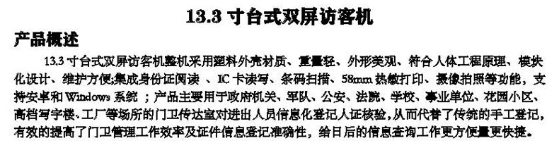 13.3寸臺(tái)式雙屏訪客機(jī)整機(jī)采用塑料外殼材質(zhì)、重量輕、外形美觀、符合人體工程原理、模塊化設(shè)計(jì)、維護(hù)方便;集成身份證閱讀 、IC卡讀寫(xiě)、條碼掃描、58mm熱敏打印、攝像拍照等功能,支持安卓和Windows系統(tǒng) ;產(chǎn)品主要用于政府機(jī)關(guān)、軍隊(duì)、公安、法院、學(xué)校、事業(yè)單位、花園小區(qū)、高檔寫(xiě)字樓、工廠等場(chǎng)所的門(mén)衛(wèi)傳達(dá)室對(duì)進(jìn)出人員信息化登記人證核驗(yàn),從而代替了傳統(tǒng)的手工登記,有效的提高了門(mén)衛(wèi)管理工作效率及證件信息登記準(zhǔn)確性,給日后的信息查詢工作更方便量更快捷。