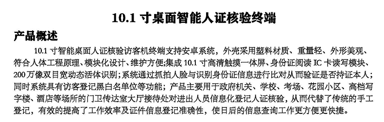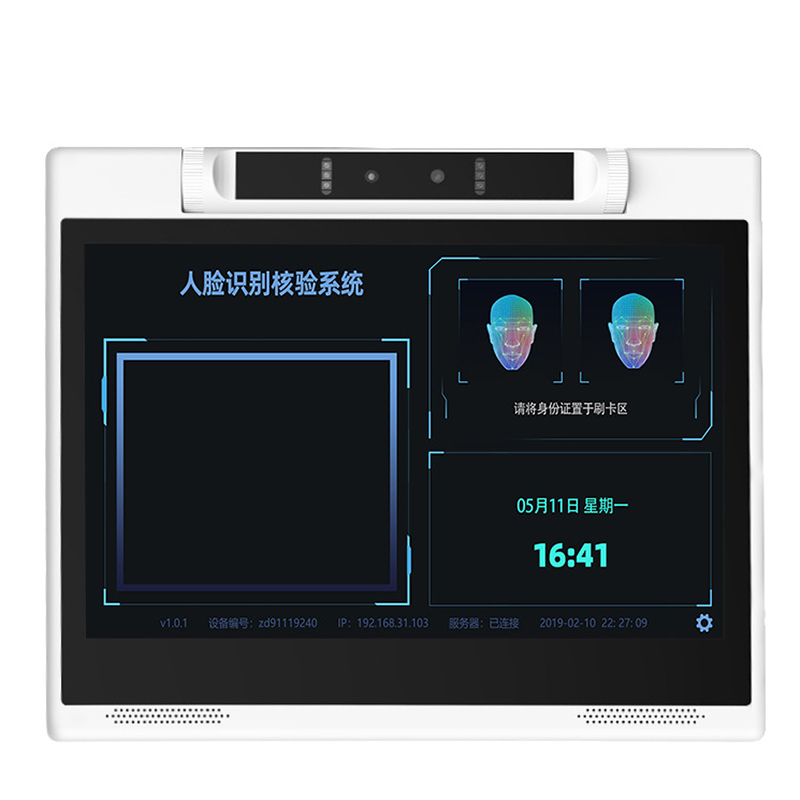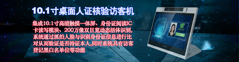 10.1寸智能桌面人證核驗訪客機終端支持安卓系統(tǒng),外殼采用塑料材質(zhì)、重量輕、外形美觀、符合人體工程原理、模塊化設計、維護方便;集成10.1寸高清觸摸一體屏、身份證閱讀IC卡讀寫模塊、200萬像雙目寬動態(tài)活體識別;系統(tǒng)通過抓拍人臉與識別身份證信息進行比對從而驗證是否持證本人;同時系統(tǒng)具有訪客登記黑白名單位等功能;產(chǎn)品主要用于政府機關、學校、考場、花園小區(qū)、高檔寫字樓、酒店等場所的門衛(wèi)傳達室大廳接待處對進出人員信息化登記人證核驗,從而代替了傳統(tǒng)的手工登記,有效的提高了工作效率及證件信息登記準確性,使日后的信息查詢工作更方便更快捷。