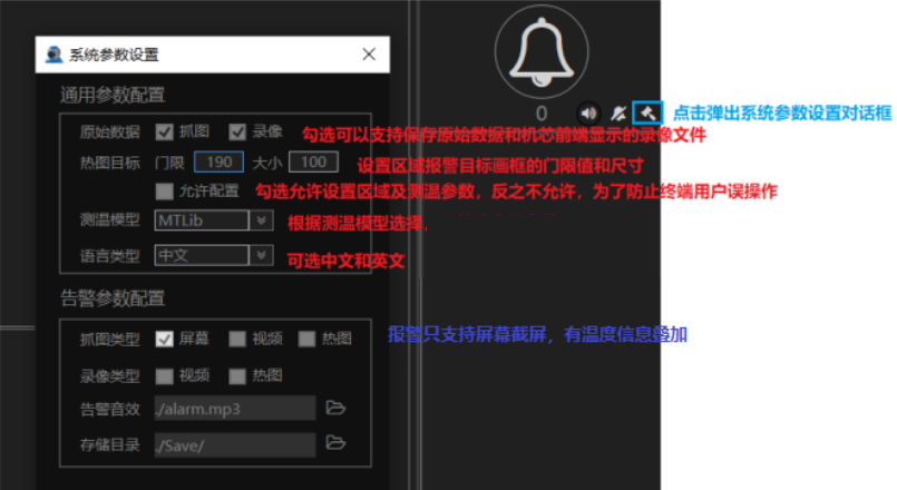 點(diǎn)擊告警信息面板中的設(shè)置圖標(biāo),如下圖藍(lán)框內(nèi),彈出系統(tǒng)參數(shù)設(shè)置對(duì)話框,如圖目標(biāo)用于設(shè)置抓取高溫目標(biāo)的門限和大小,對(duì)于人體測溫檢測目標(biāo)一般選190,可以上下小范圍調(diào)整,越小越靈敏,大小表示自動(dòng)抓取高溫目標(biāo)的大小,100表示100個(gè)像數(shù)的大?。ㄈ?span>10x10,5x20都是100像數(shù)),可以通過設(shè)置大小過濾小目標(biāo),根據(jù)場景監(jiān)控距離設(shè)置。