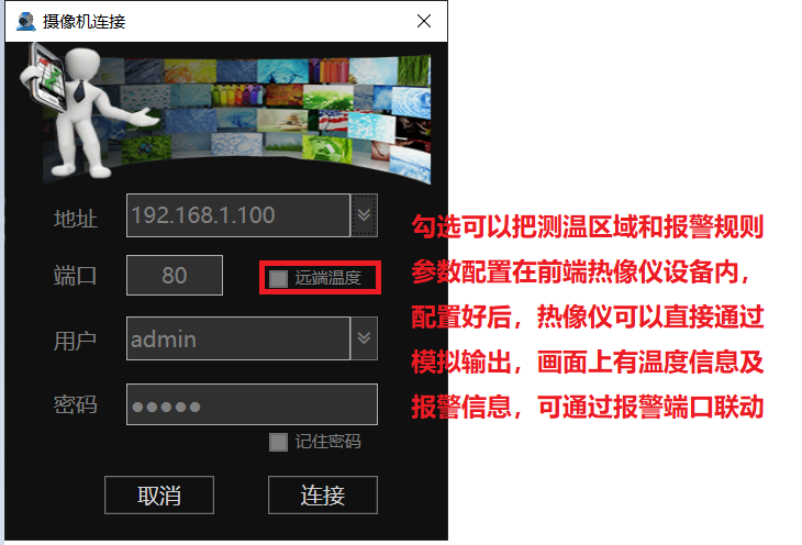 本軟件支持接入具有前端測溫功能的我司熱像產(chǎn)品,登入設(shè)備的時(shí)候勾選遠(yuǎn)端測溫即可(需要前端熱像儀支持此功能),設(shè)置方法參考上面說明,配置成功后熱像可以通過模擬輸出連接監(jiān)視器監(jiān)控測溫,監(jiān)控畫面可顯示配置的區(qū)域及目標(biāo)溫度。產(chǎn)生告警,畫面右上角會(huì)有報(bào)警圖標(biāo),報(bào)警信號(hào)也可以通過熱像報(bào)警輸出口外接報(bào)警設(shè)備。