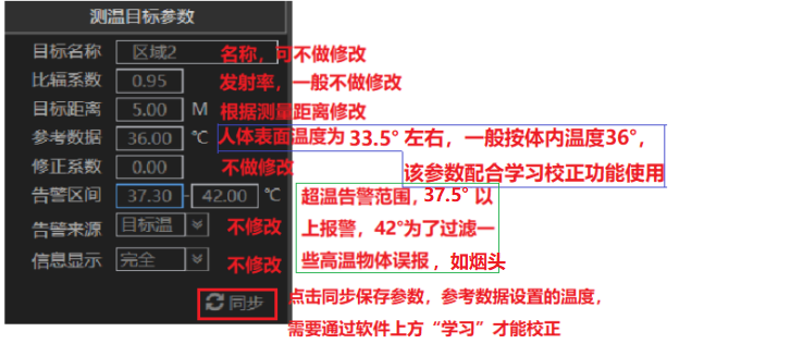 設(shè)置好溫度參考點(diǎn),內(nèi)置和外置溫感模式無需在設(shè)置參數(shù),黑體模式修改“參考數(shù)據(jù)”的溫度為黑體的溫度,其他參數(shù)無需配置,點(diǎn)擊“同步”即可 。