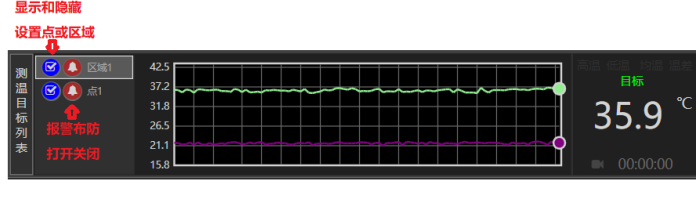 軟件具有告警布防功能,默認(rèn)打開,在軟件下方測溫目標(biāo)列表,可以配置設(shè)置的區(qū)域的布防開關(guān),還可以顯示和隱藏?zé)嵯褚曨l中設(shè)置的測溫點(diǎn)和區(qū)域。選中某個(gè)區(qū)域,下方可顯示該區(qū)域的最高溫及統(tǒng)計(jì)曲線。