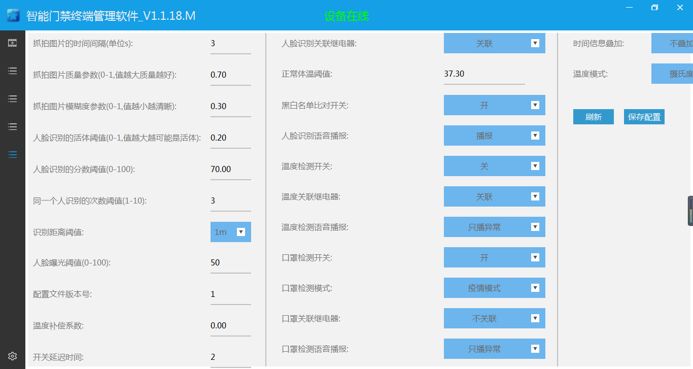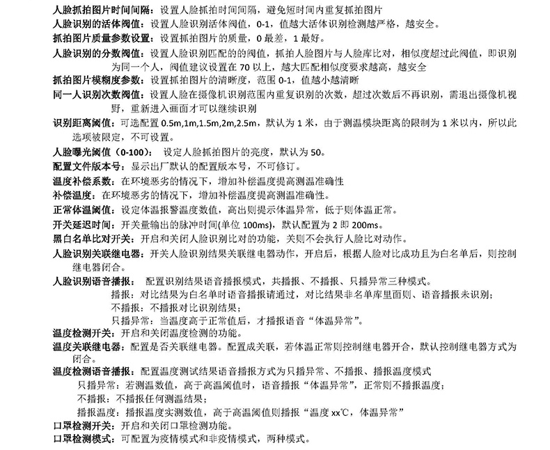 ???用戶可設(shè)置人臉抓拍的關(guān)鍵參數(shù)和開關(guān)設(shè)備功能。設(shè)備支持人臉識別比對、體溫檢測、口罩檢測三大功能,用戶可自由組合配置開關(guān)功能,是否關(guān)聯(lián)控制繼電器,是否播報(bào)語音提醒等。例如用戶要求體溫正常即可開門,則開啟體溫檢測功能,其余關(guān)閉即可實(shí)現(xiàn);若用戶要求規(guī)定的人,體溫正常且佩戴口罩后才可以開門,則必須同時(shí)開啟人臉識別比對、體溫檢測、口罩檢測,當(dāng)此三項(xiàng)全部檢測正常才會控制繼電器開門。配置界面和具體詳細(xì)如下所述。