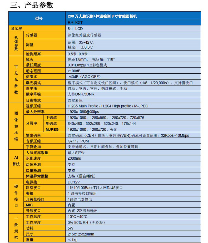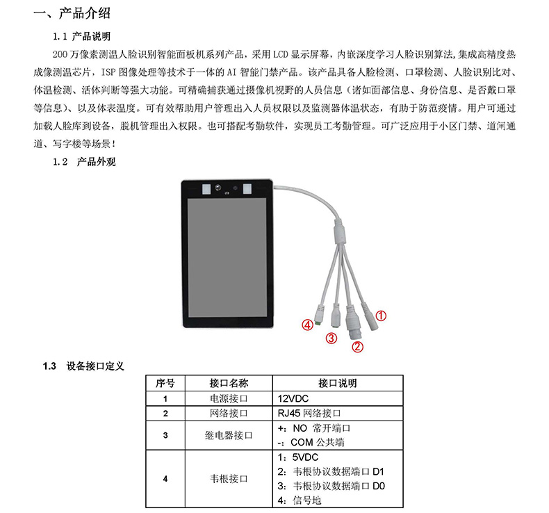 200萬像素測溫人臉識別智能面板機(jī)系列產(chǎn)品,采用LCD顯示屏幕,內(nèi)嵌深度學(xué)習(xí)人臉識別算法,集成高精度熱成像測溫芯片,ISP圖像處理等技術(shù)于一體的AI智能門禁產(chǎn)品。該產(chǎn)品具備人臉檢測、口罩檢測、人臉識別比對、體溫檢測、活體判斷等強(qiáng)大功能。可精確捕獲通過攝像機(jī)視野的人員信息(諸如面部信息、身份信息、是否戴口罩等信息)、以及體表溫度??捎行椭脩艄芾沓鋈肴藛T權(quán)限以及監(jiān)測器體溫狀態(tài),有助于防范疫情。用戶可通過加載人臉庫到設(shè)備,脫機(jī)管理出入權(quán)限。也可搭配考勤軟件,實(shí)現(xiàn)員工考勤管理??蓮V泛應(yīng)用于小區(qū)門禁、道閘通道、寫字樓等場景!