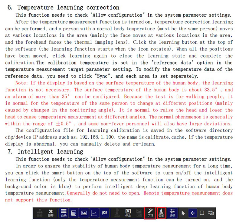 為了保證長(zhǎng)時(shí)間人體測(cè)溫的穩(wěn)定性,可以點(diǎn)擊軟件上方智能按鈕開(kāi)啟/關(guān)閉智能學(xué)習(xí)功能(只有啟動(dòng)測(cè)溫功能才能開(kāi)啟,底色為藍(lán)色為開(kāi)啟),進(jìn)行人體測(cè)溫智能深度學(xué)習(xí)功能。一般不需要開(kāi)啟。遠(yuǎn)端測(cè)溫不支持此功能。