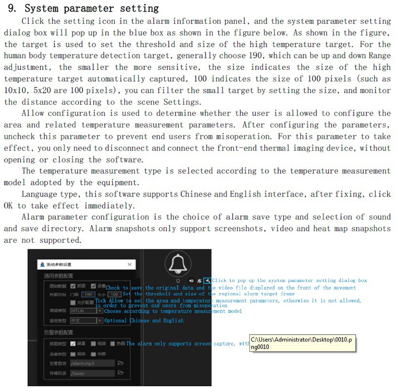 點(diǎn)擊告警信息面板中的設(shè)置圖標(biāo),如下圖藍(lán)框內(nèi),彈出系統(tǒng)參數(shù)設(shè)置對(duì)話(huà)框,如圖目標(biāo)用于設(shè)置抓取高溫目標(biāo)的門(mén)限和大小,對(duì)于人體測(cè)溫檢測(cè)目標(biāo)一般選190,可以上下小范圍調(diào)整,越小越靈敏,大小表示自動(dòng)抓取高溫目標(biāo)的大小,100表示100個(gè)像數(shù)的大?。ㄈ?span>10x10,5x20都是100像數(shù)),可以通過(guò)設(shè)置大小過(guò)濾小目標(biāo),根據(jù)場(chǎng)景監(jiān)控距離設(shè)置。