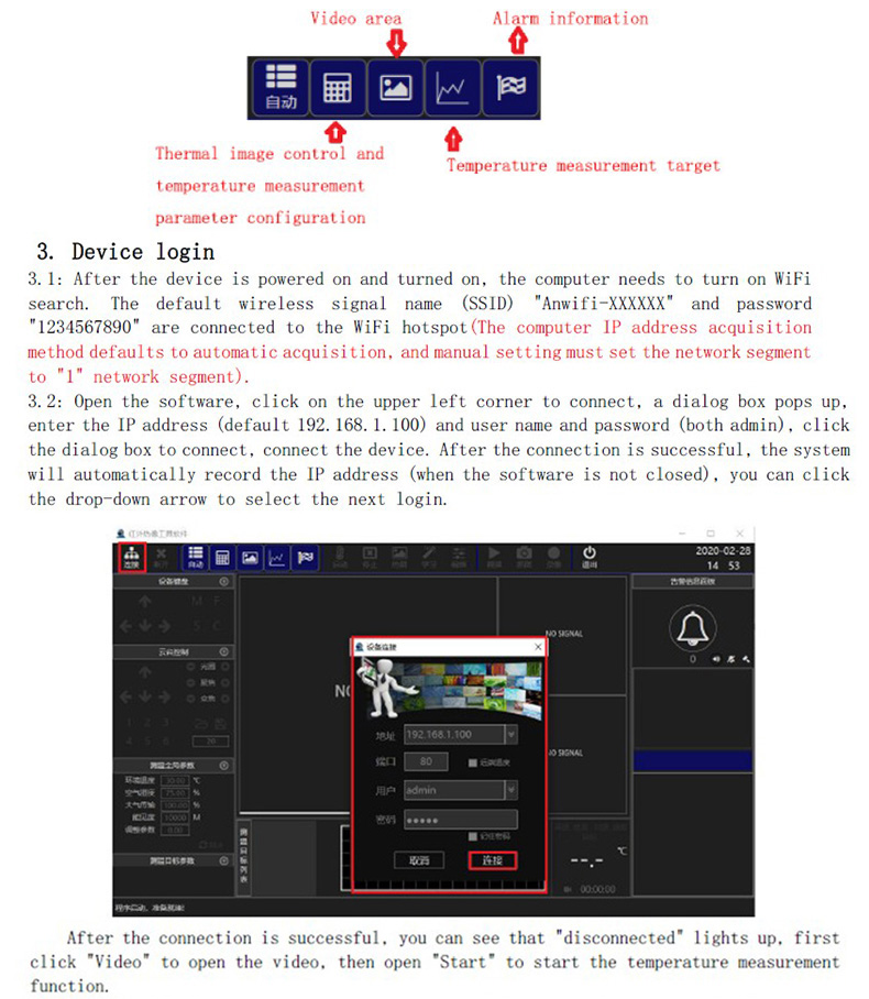 安裝好設(shè)備后,接通電源給設(shè)備上電,設(shè)備使用DC12V電源,用網(wǎng)絡(luò)和電腦連接,如果設(shè)備帶前端測(cè)溫功能(參數(shù)配置還需要測(cè)溫軟件配置),則可以連接到監(jiān)視器監(jiān)控。在電腦上打開(kāi)測(cè)溫軟件,連接設(shè)備,默認(rèn)IP地址為192.168.1.100。注意電腦IP地址需要在同一個(gè)網(wǎng)段。