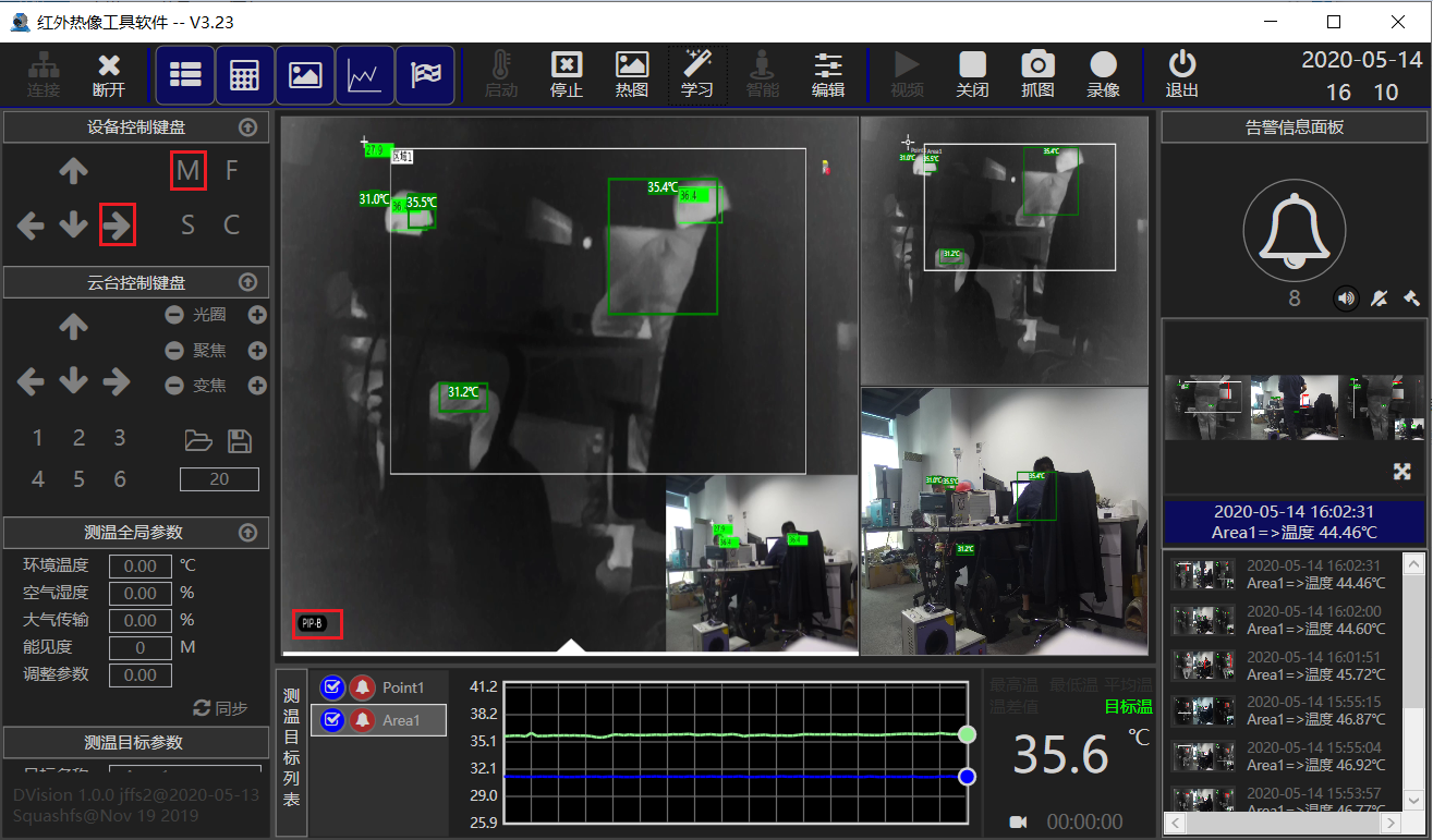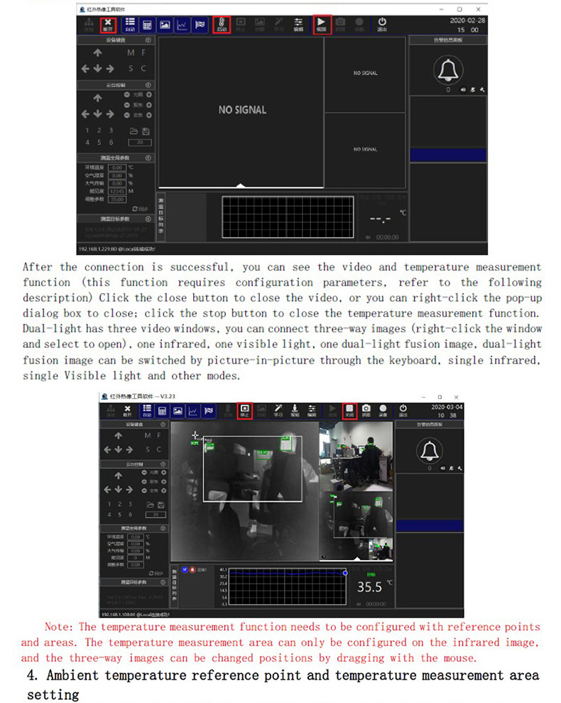 ??? 雙光模組通過(guò)網(wǎng)絡(luò)圖傳連接PC,PC端安裝測(cè)溫軟件,該軟件可以連接熱像和可見(jiàn)光視頻,可以設(shè)置點(diǎn)和區(qū)域測(cè)溫,區(qū)域內(nèi)可自動(dòng)追蹤人員并顯示溫度,可配置超溫報(bào)警,實(shí)現(xiàn)報(bào)警抓拍功能。