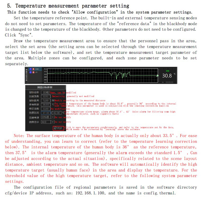 注:如果按照人體表面溫度顯示,可不用學(xué)習(xí)功能。人體表面溫度33.5°左右,可以配置35°以上報(bào)警。由于測(cè)試的是走動(dòng)的人員,同一個(gè)人在不同位置(主要是監(jiān)視角度有變化引起的)溫度有變化屬于正常,抬頭低頭造成不同角度的測(cè)溫是有偏差的,不同個(gè)人之間也有溫度偏差屬于正常現(xiàn)象,一般在±0.5°屬于正常范圍,個(gè)別非發(fā)燒人員也會(huì)也較大偏差。
