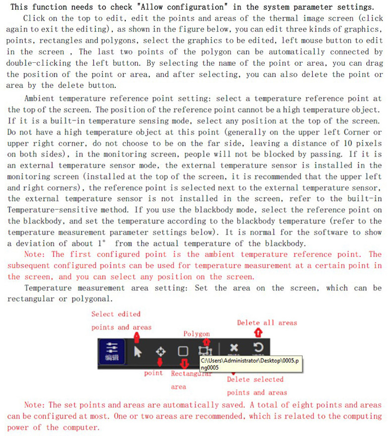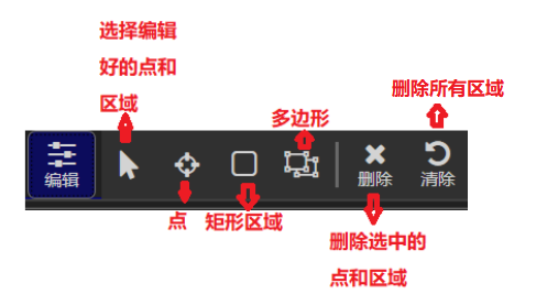 點(diǎn)擊上方編輯,編輯熱像畫(huà)面的點(diǎn)和區(qū)域(再次點(diǎn)擊編輯退出編輯),如下圖,可以編輯三種圖形,點(diǎn)、矩形和多邊形,選擇需要編輯的圖形,鼠標(biāo)左鍵在畫(huà)面中編輯即可,多邊形最后兩點(diǎn)通過(guò)雙擊左鍵可以自動(dòng)連接。通過(guò)選中點(diǎn)或區(qū)域名稱(chēng),可以拖動(dòng)點(diǎn)或區(qū)域位置,選中后也可通過(guò)刪除按鈕刪除點(diǎn)或區(qū)域。