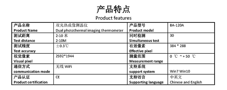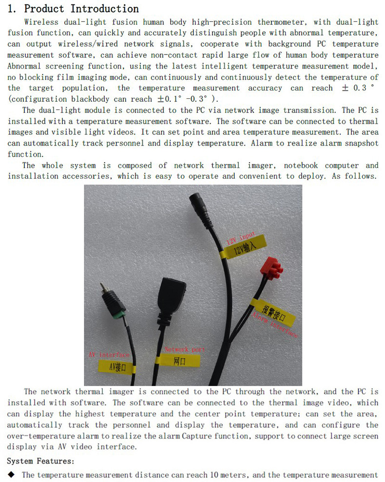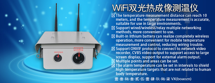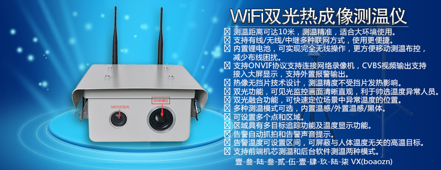 無(wú)線(xiàn)雙光融合人體高精度測(cè)溫儀,具有雙光融合功能,可快速準(zhǔn)確地分辨溫度異常人員,可輸出無(wú)線(xiàn)/有線(xiàn)網(wǎng)絡(luò)信號(hào),配合后臺(tái)PC測(cè)溫軟件,可實(shí)現(xiàn)非接觸快速大流量人體溫度異常篩選功能,采用最新智能測(cè)溫模型,無(wú)擋片成像方式,可以連續(xù)不間斷對(duì)目標(biāo)人群進(jìn)行溫度檢測(cè),測(cè)溫精度可達(dá)±0.3°(配置黑體可達(dá)±0.1°-0.3°)。