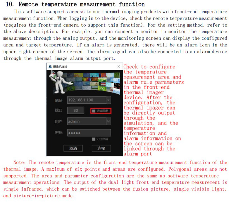本軟件支持接入具有前端測(cè)溫功能的我司熱像產(chǎn)品,登入設(shè)備的時(shí)候勾選遠(yuǎn)端測(cè)溫即可(需要前端熱像儀支持此功能),設(shè)置方法參考上面說(shuō)明,配置成功后熱像可以通過(guò)模擬輸出連接監(jiān)視器監(jiān)控測(cè)溫,監(jiān)控畫(huà)面可顯示配置的區(qū)域及目標(biāo)溫度。產(chǎn)生告警,畫(huà)面右上角會(huì)有報(bào)警圖標(biāo),報(bào)警信號(hào)也可以通過(guò)熱像報(bào)警輸出口外接報(bào)警設(shè)備。