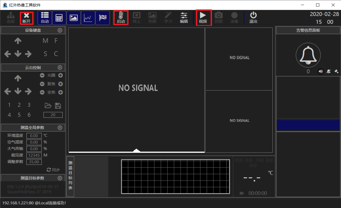 連接成功后,可看到“斷開(kāi)”變亮,首先點(diǎn)擊“視頻”,打開(kāi)視頻,然后打開(kāi)“啟動(dòng)”,啟動(dòng)測(cè)溫功能。