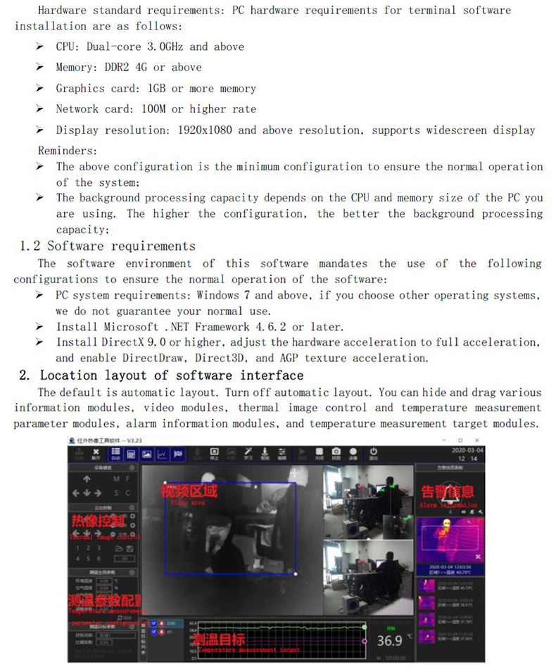 博奧智能熱像儀通過(guò)網(wǎng)絡(luò)連接PC,PC端安裝軟件,該軟件可以連接熱像視頻,可以顯示最高溫,中心點(diǎn)溫度;可以設(shè)置區(qū)域,自動(dòng)追蹤人員并顯示溫度,可配置超溫報(bào)警,實(shí)現(xiàn)報(bào)警抓拍功能,支持通過(guò)AV視頻接口連接大屏顯示器。