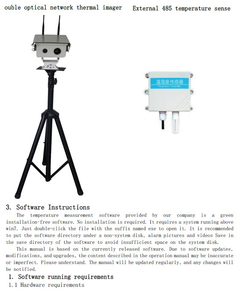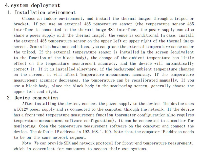 選擇一個(gè)室內(nèi)壞境,通過(guò)三腳架或支架固定安裝熱像儀,如果使用外置485溫感(溫感485接口和熱像的485接口連接,供電也可以和熱像共用一個(gè)電源),場(chǎng)地有條件情況下,把外置485溫感安裝在熱像畫(huà)面的左上方或右上方。有些場(chǎng)地沒(méi)有條件,可以把外置溫感放置在三角架下。如果外置溫感安裝在畫(huà)面中(等同于黑體的作用),環(huán)境溫度的變化對(duì)測(cè)溫精度度影響很小,設(shè)備會(huì)自動(dòng)校正,如果安裝在別處,畫(huà)面中背景環(huán)境溫度變化的話(huà),會(huì)影響測(cè)溫精度,如果測(cè)溫精度下降,可手動(dòng)重新校正溫度。如果使用黑體,把黑體放置在監(jiān)控畫(huà)面中,一般選左右上方。