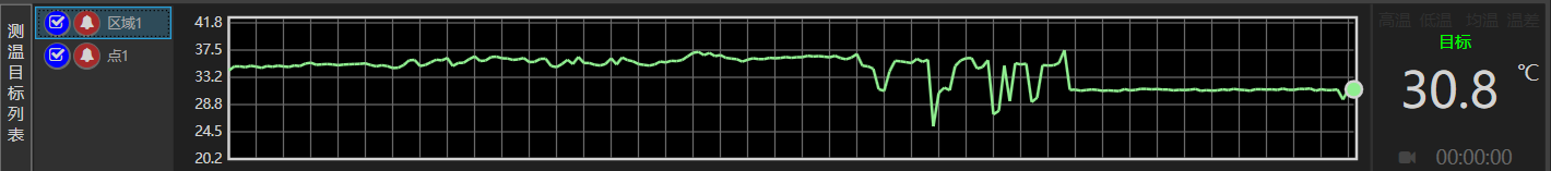 軟件具有告警布防功能,默認(rèn)打開(kāi),在軟件下方測(cè)溫目標(biāo)列表,可以配置設(shè)置的區(qū)域的布防開(kāi)關(guān),還可以顯示和隱藏?zé)嵯褚曨l中設(shè)置的測(cè)溫點(diǎn)和區(qū)域。選中某個(gè)區(qū)域,下方可顯示該區(qū)域的最高溫及統(tǒng)計(jì)曲線(xiàn)。