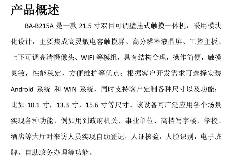 BA-B215A是一款21.5寸雙目可調(diào)壁掛式觸摸一體機,采用模塊化設(shè)計,主要集成高靈敏電容觸摸屏、高分辨率液晶屏、工控主板、上下可調(diào)高清攝像頭、WIFI等模組,具有結(jié)構(gòu)合理,操作簡便,觸摸靈敏,性能穩(wěn)定,方便維護等優(yōu)點;根據(jù)客戶開發(fā)需求可選擇安裝Android系統(tǒng) 和WIN系統(tǒng),同時支持客戶定制各種尺寸以及功能;比如10.1寸,13.3寸,15.6寸等尺寸。該設(shè)備可廣泛應(yīng)用各個場景實現(xiàn)各種功能,例如用到政府機關(guān)、事業(yè)單位、高檔寫字樓,學(xué)校、酒店等大廳對來訪人員實現(xiàn)自助登記,人證核驗,人臉識別,電子班牌,自助政務(wù)辦理等功能。