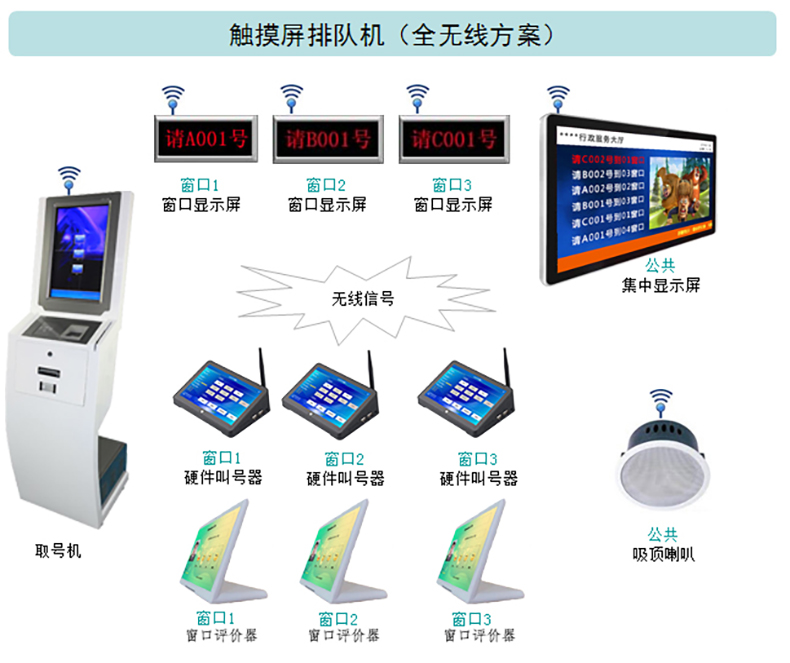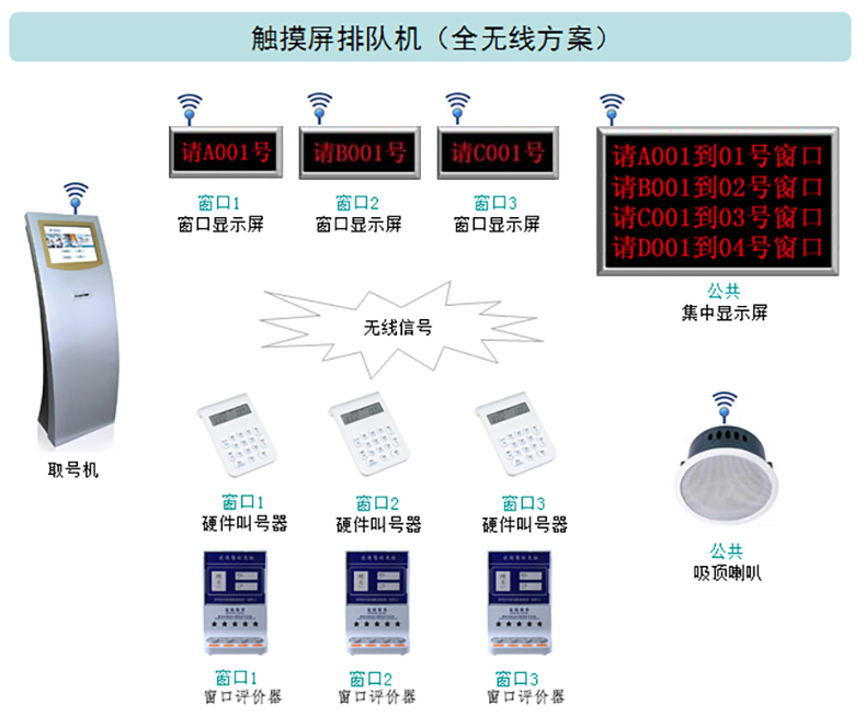 產(chǎn)品配置:無線觸摸屏排隊機(jī) 液晶呼叫器 無線呼叫器 無線窗口屏 無線綜合屏 無線評價器 無線吸頂喇叭 液晶窗口顯示屏 液晶集中顯示屏
