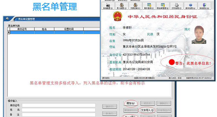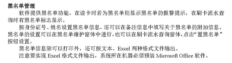 軟件提供黑名單功能,在讀卡時若為黑名單則顯示黑名單的報警提示,在刷卡流水查詢時有黑名單標(biāo)志顯示。