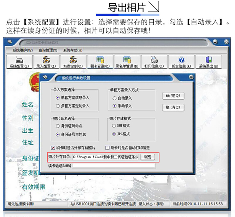 5、 讀卡驗證軟件可提供照片信息外部存儲,存儲格式支持BMP、JPG,存儲文件名稱允許用戶按姓名及身份證等信息選擇定義。