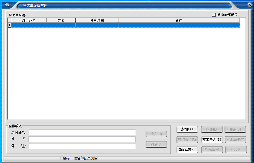 按身份證號、姓名設(shè)置黑名單信息,還可以在備注信息中填寫關(guān)于黑名單的附加信息。黑名單的設(shè)置可以在黑名單維護窗體中進行,也可以在刷卡流水查詢窗體,點擊“置黑名單”按鈕設(shè)置。
