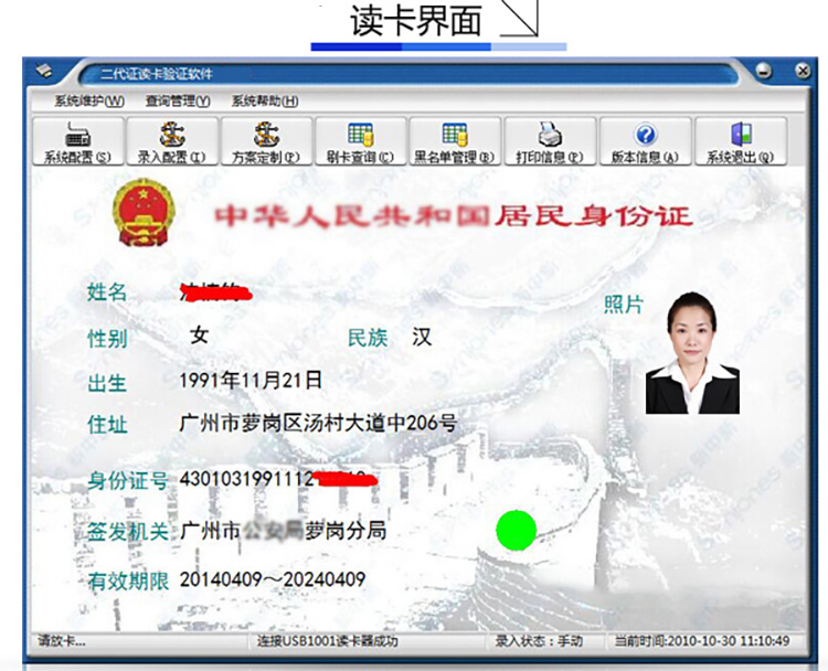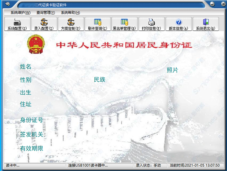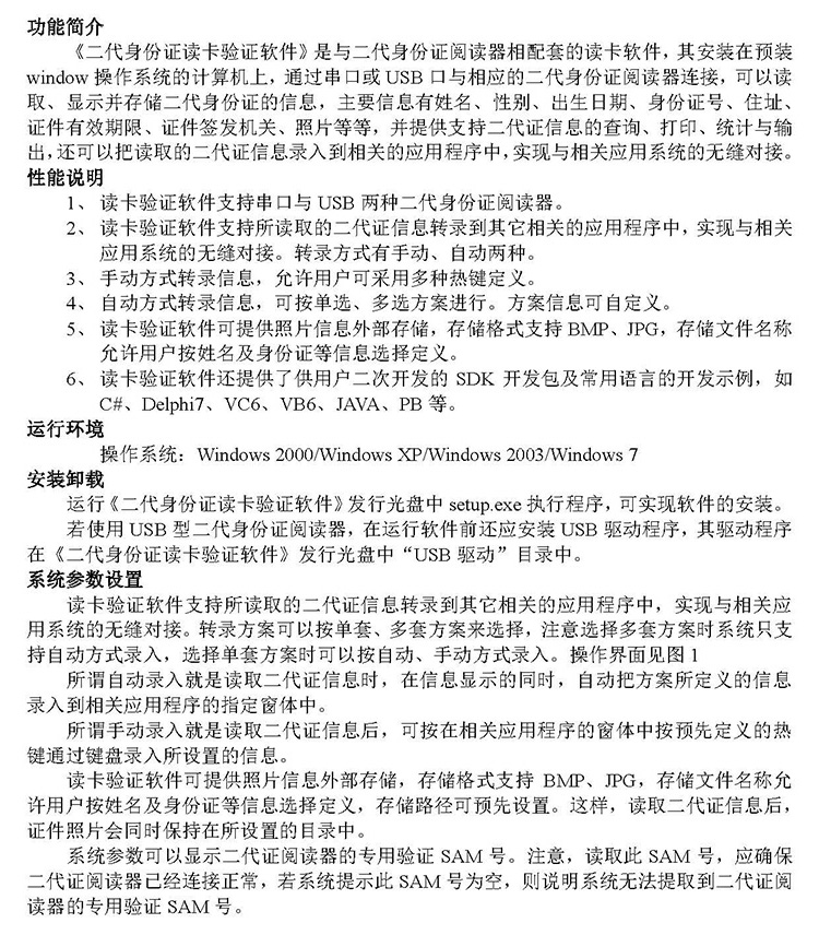 《二代身份證讀卡驗證軟件》是與二代身份證閱讀器相配套的讀卡軟件,其安裝在預(yù)裝window操作系統(tǒng)的計算機上,通過串口或USB口與相應(yīng)的二代身份證閱讀器連接,可以讀取、顯示并存儲二代身份證的信息,主要信息有姓名、性別、出生日期、身份證號、住址、證件有效期限、證件簽發(fā)機關(guān)、照片等等,并提供支持二代證信息的查詢、打印、統(tǒng)計與輸出,還可以把讀取的二代證信息錄入到相關(guān)的應(yīng)用程序中,實現(xiàn)與相關(guān)應(yīng)用系統(tǒng)的無縫對接。