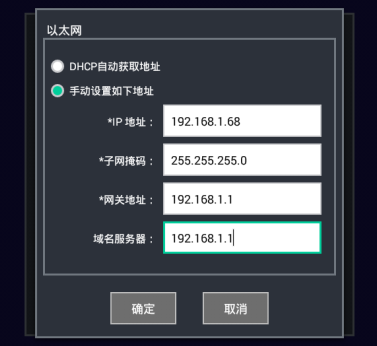 終端網絡配置可以選擇以太網、WiFi和移動網絡中的一種并配置相應的參數。以太網設置界面如下圖所示,可以選擇DHCP自動獲取地址(局域網中有DHCP服務器則建議使用)或者手動設置如下地址(局域網中午DHCP服務器或者不允許使用動態(tài)地址時使用)。