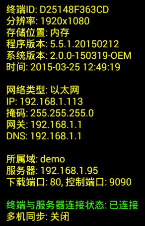 BA-iDS6終端軟件內置安裝在安卓主板上,主板開機后自動運行終端程序進入播放狀態(tài)。按遙控器的INFO鍵,或快速點擊屏幕任意一個角落四次,可呼出如下圖所示的終端運行狀態(tài)信息,包括終端ID、分辨率、節(jié)目存儲位置、播放程序版本、安卓系統(tǒng)版本、機器時間、網絡參數、服務器參數、終端到服務器的連接狀態(tài)、多級同步開關等信息。