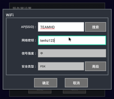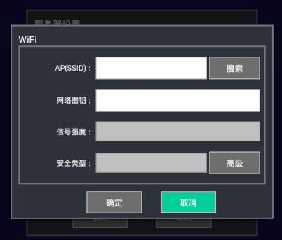 WiFi配置如下面圖片所示,可通過WiFi配置界面的搜索按鈕打開手動搜索界面,通過刷新按鈕更新無線AP列表,并在搜索結果列表中選擇合適的AP名稱(AP名稱也可以自行手動直接輸入),同時輸入相應的網絡密鑰即可完成WiFi的設置。如果某些AP不支持DHCP動態(tài)分配IP地址或者網絡環(huán)境不允許使用動態(tài)IP地址,則可通過高級按鈕進入手動設置IP地址界面(設置界面完全類似以太網的手動設置IP地址界面)。