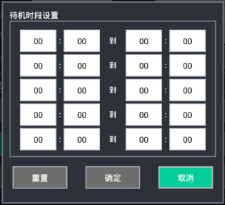 待機時段設置界面如下圖所示,最多可設置五個終端機的待機時段,00:00~00:00表示空配置項。終端機一旦進入待機時段時間點則停止播放且輸出黑屏。