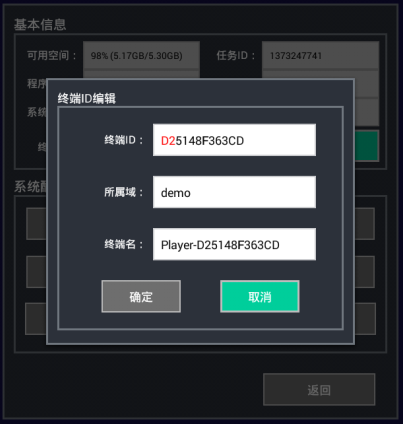 終端基本信息中的[設置]按鈕彈出界面如下圖所示,可進行終端ID、所屬域、終端名稱的編輯。終端所屬域定義了終端在服務器的在哪個域中可見,如果為空則默認為demo域。請注意:如果服務器強制將終端錄入到了某個域,則終端一旦聯(lián)網就會自動轉換到相應的域