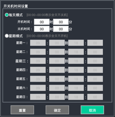 開關時間設置用于設定終端機的定時開關機時間,包括每天模式和星期模式兩種模式。每天模式指定終端機每天的開機時間點和關機時間點;全天不關機則設定為00:00~00:00。星期模式指定終端機每周天的具體開關機時間;某個周天不開機則設定為00:00~00:00。