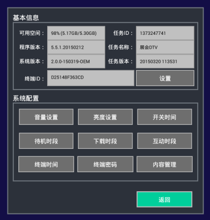 終端系統(tǒng)配置功能中包括音量設置、亮度設置、開關時間、待機時段、下載時段、互動時段、終端時間、終端密碼、內容管理等。